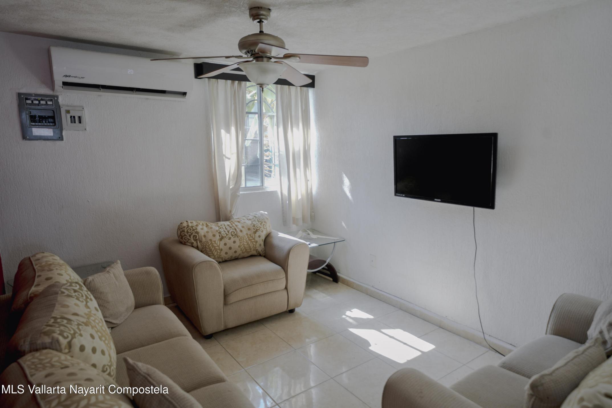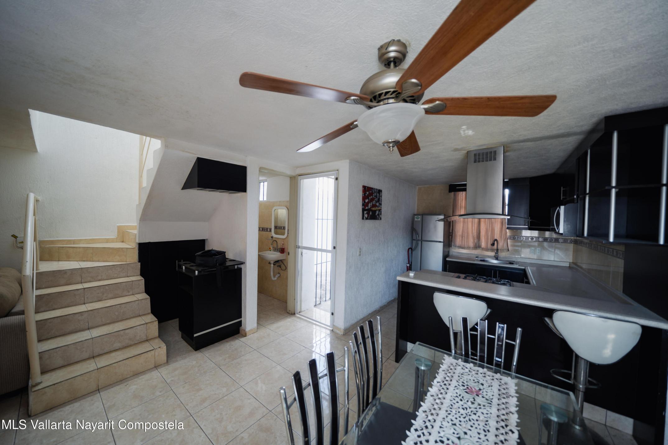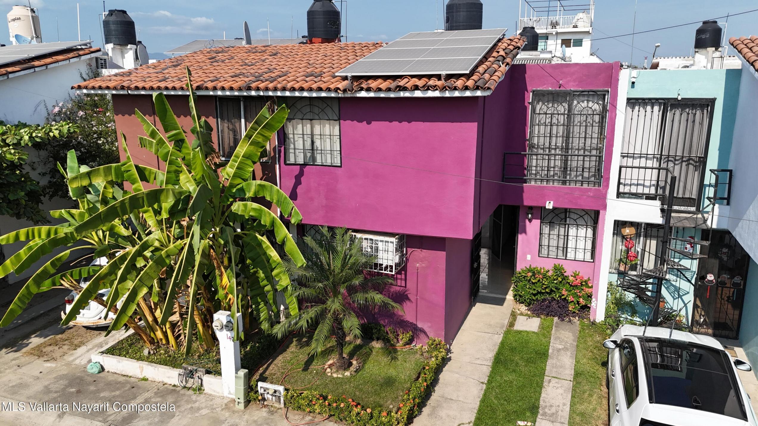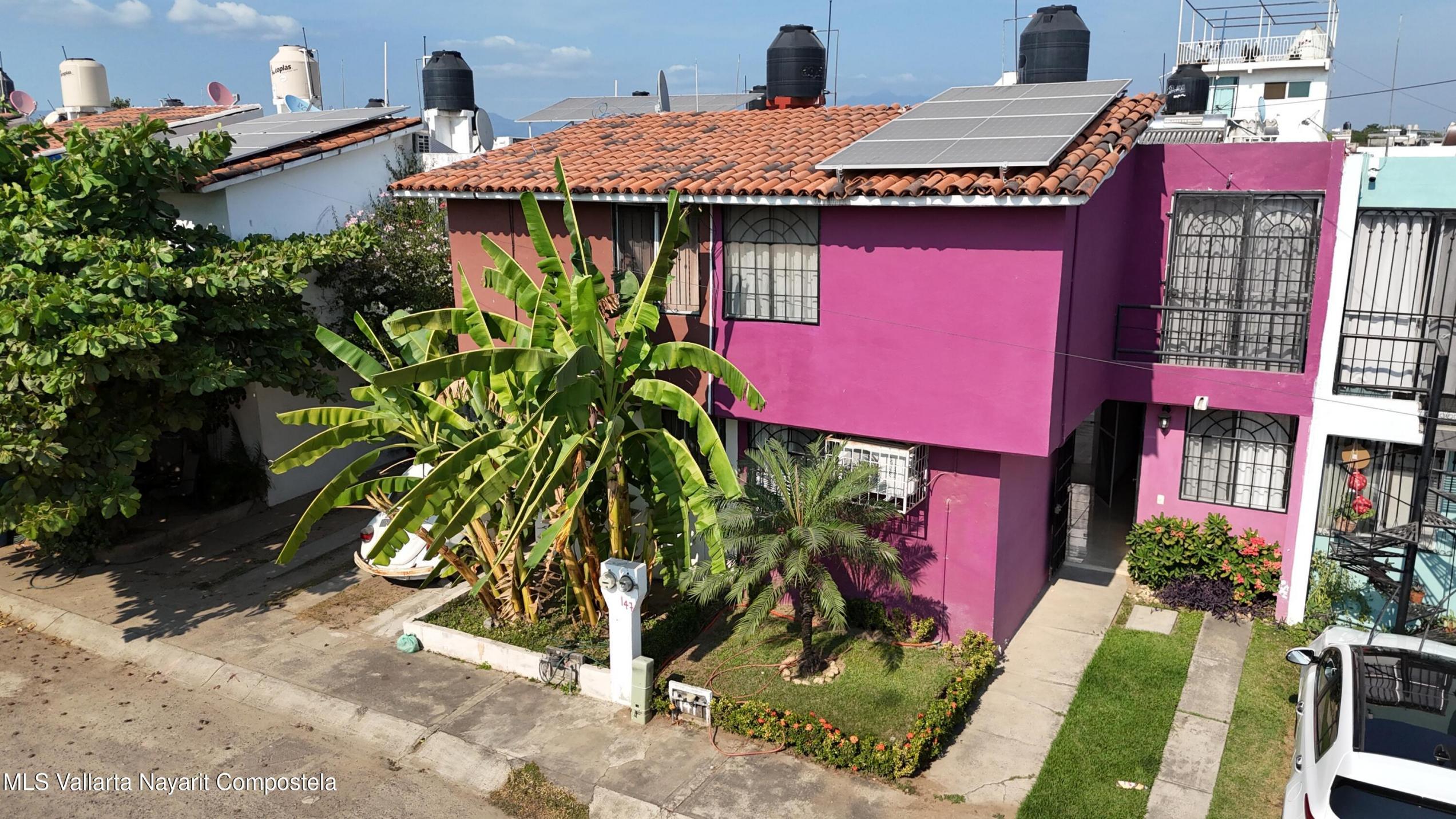 This house is located just 20 meters from the main avenue, Tlaxcala. It is a 5-minute drive to the Lago Real shopping center and 20 minutes to the nearest beach in Nuevo Vallarta. It is situated in one of the most accessible neighborhoods in Bahia de Banderas, featuring alternate routes with three different entry and exit points. The house has two levels, featuring 3 bedrooms and 1.5 bathrooms. The ground floor includes a living-dining area and a spacious backyard. The living room is very spacious, offering enough room to build a fourth bedroom in the future if desired. The kitchen is fully equipped, and there is one parking space. It is worth noting that the house is sold fully furnished. It also comes equipped with a water heater, 3 air conditioning units, ceiling fans, solar panels
