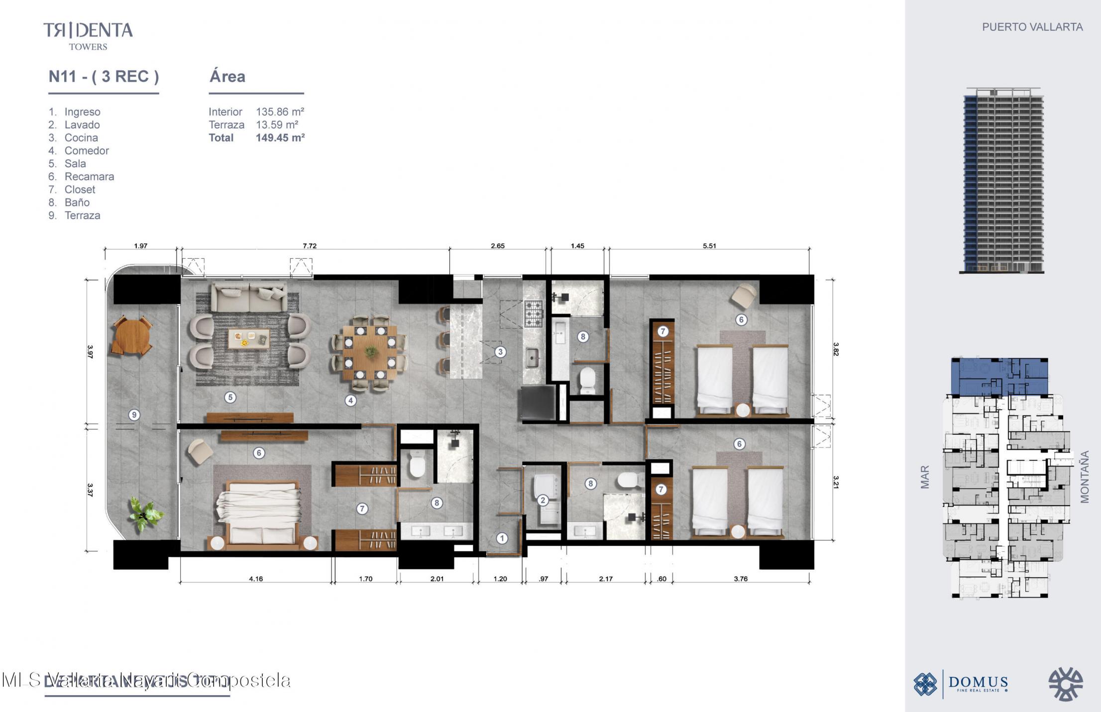 Disenado por los aclamados arquitectos de GVA, Tridenta Towers presenta un estilo de vida de playa en la Zona Hotelera de Puerto Vallarta. Esta obra maestra arquitectonica ofrece 312 exquisitas residencias en la Torre 1, desde estudios hasta departamentos de 3 habitaciones, cada uno con impresionantes vistas al mar o a las montanas. Disfruta de amenidades que incluyen albercas infinity, una increible terraza superior con vistas panoramicas a la bahia, un beach club, canchas de padel, gimnasio y exuberantes jardines tropicales. Su ubicacion privilegiada combina la tranquilidad de vivir frente al mar con facil acceso a restaurantes y vida nocturna. Estacionamiento disponible con costo adicional.