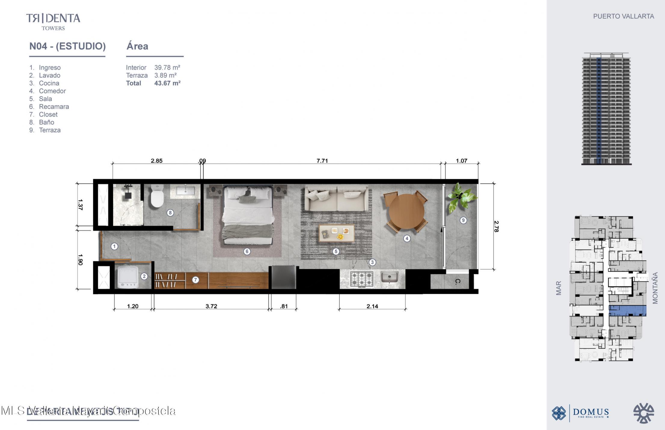 Disenado por los aclamados arquitectos de GVA, Tridenta Towers presenta un estilo de vida de playa en la Zona Hotelera de Puerto Vallarta. Esta obra maestra arquitectonica ofrece 312 exquisitas residencias en la Torre 1, desde estudios hasta departamentos de 3 habitaciones, cada uno con impresionantes vistas al mar o a las montanas. Disfruta de amenidades que incluyen albercas infinity, una increible terraza superior con vistas panoramicas a la bahia, un beach club, canchas de padel, gimnasio y exuberantes jardines tropicales. Su ubicacion privilegiada combina la tranquilidad de vivir frente al mar con facil acceso a restaurantes y vida nocturna. Estacionamiento disponible con costo adicional.