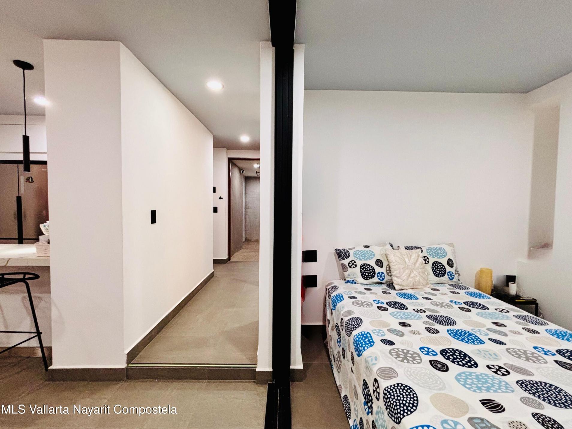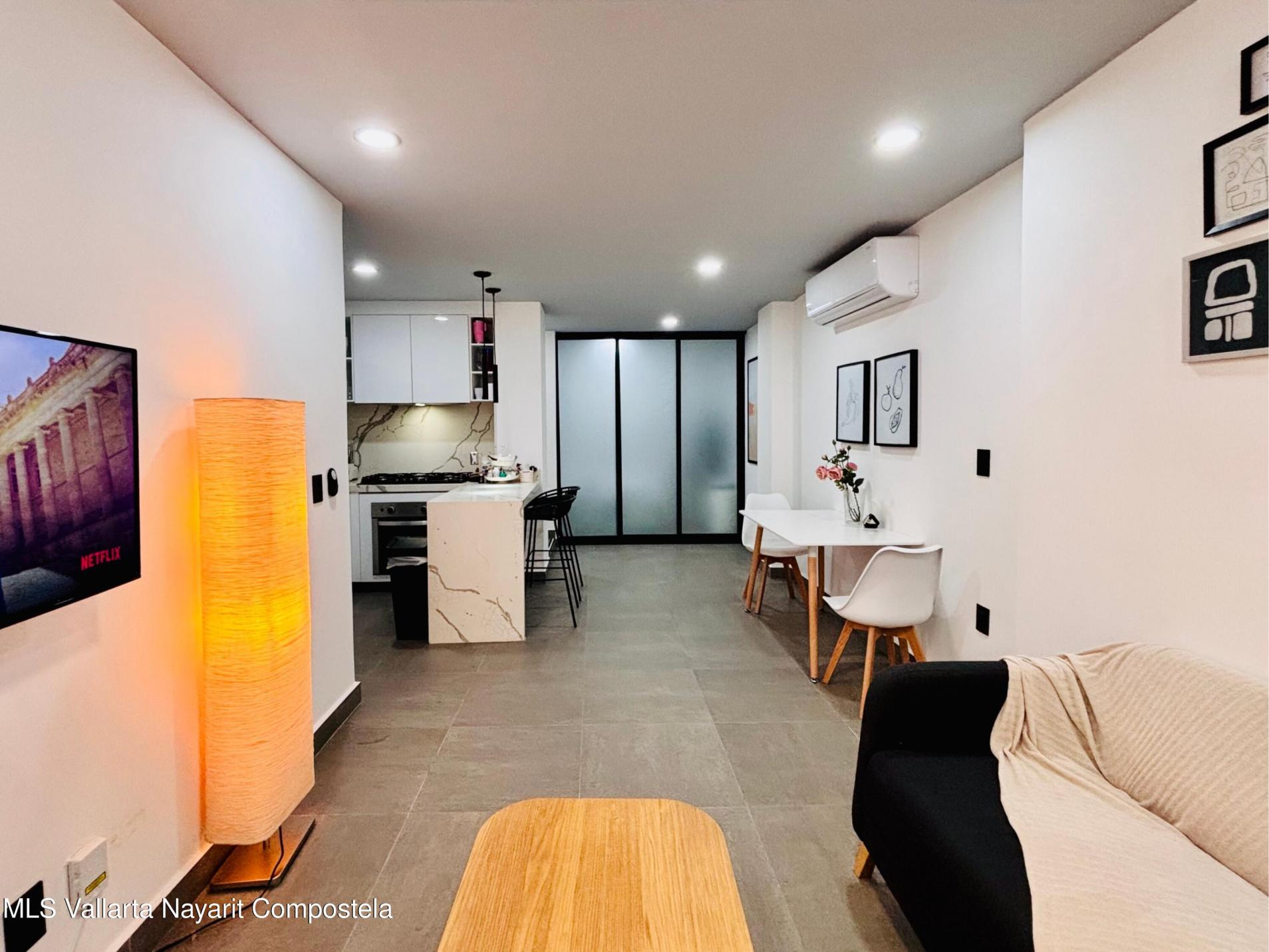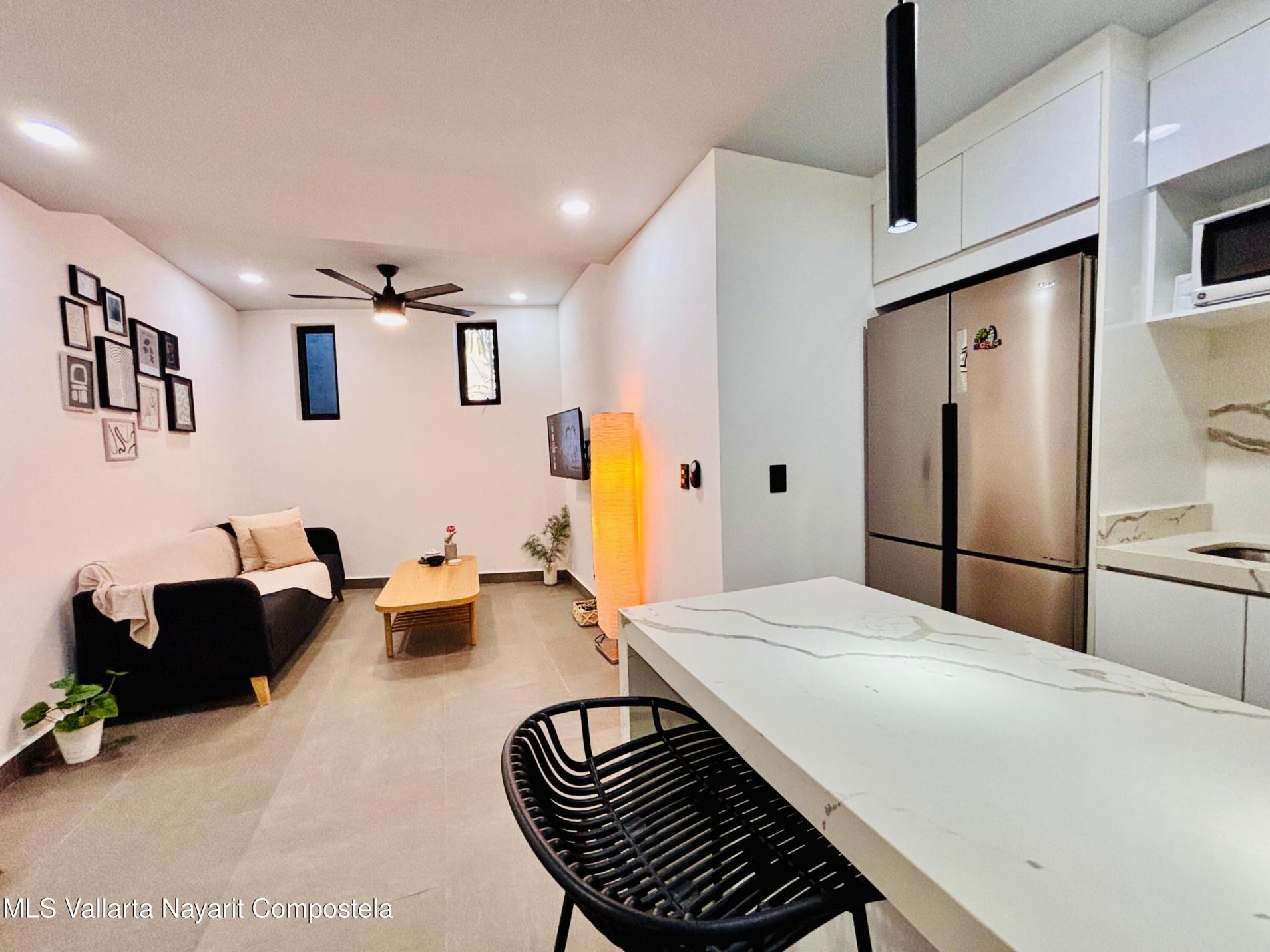 Unidad inteligentemente disenada y completamente amueblada, a solo 5 cuadras de las playas de la Zona Dorada. Cuenta con una configuracion flexible que permite dos Areas de recamara independientes, ambas con puerta (una tradicional y una corrediza), asi como dos banos completos, acabados de alta calidad, barra de cuarzo, muros y plafones con acentos de color y mini-splits, lo que la hace especialmente atractiva para rentas vacacionales y estancias prolongadas. La cocina cuenta con refrigerador, horno, parrilla, microondas y centro de lavado. Incluye un cajon de estacionamiento y bodega. El roof top tiene alberca tipo infinito, area de asadores, bano, regadera y amplios espacios para reuniones y asolearse.