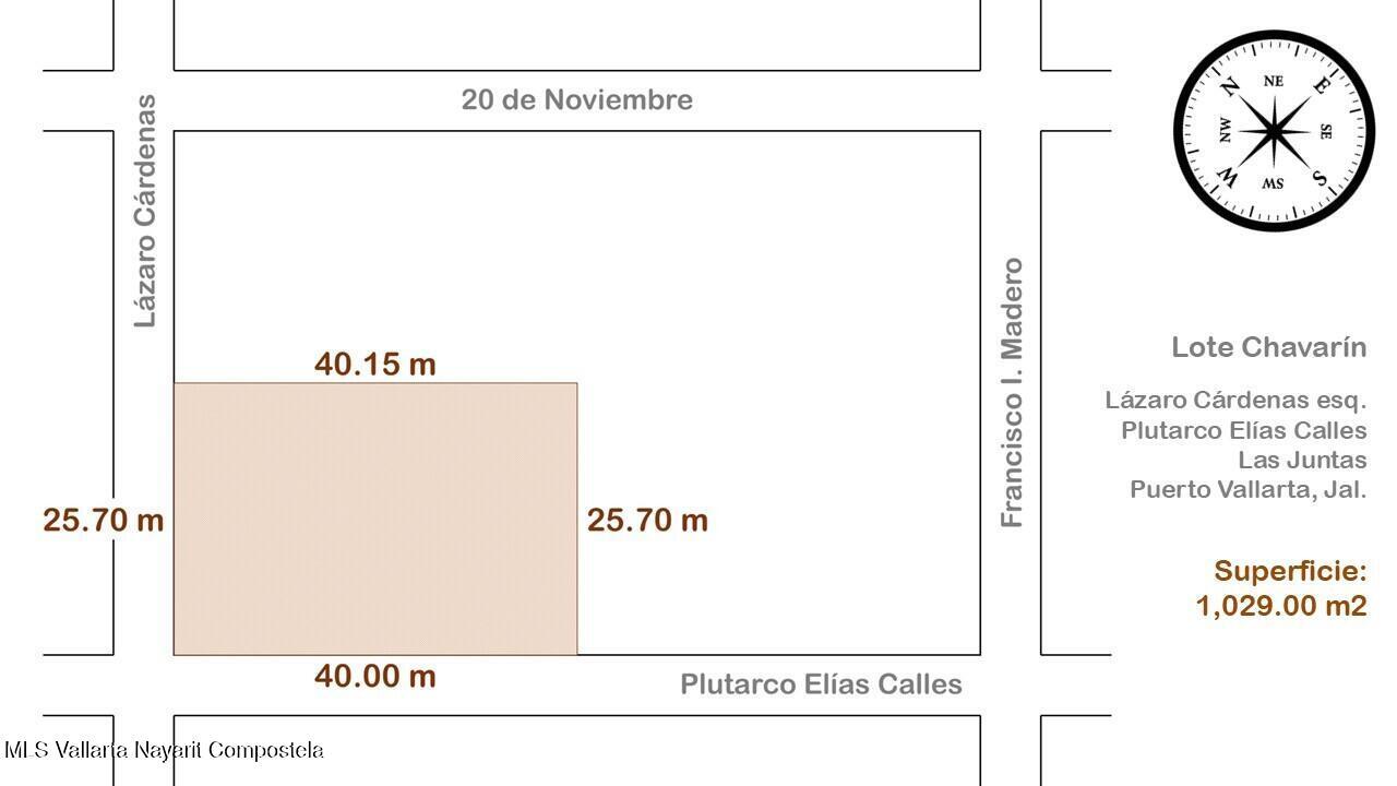 Lote en esquina de 1,029 m2 en Las Juntas con uso de suelo mixto. Cuenta con casa habitacion de 93 m2 y terraza/bodega de 525 m2 en buen estado. Ideal para desarrollo de departamentos o proyectos comerciales y habitacionales. Servicios de agua, luz y drenaje. Ubicado a 5 minutos de la Carretera Federal 200 y cerca del Aeropuerto de Puerto Vallarta, en zona tranquila.