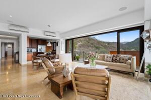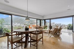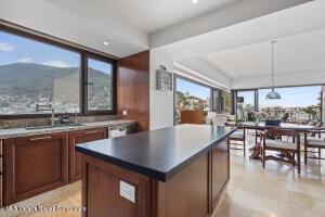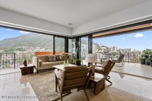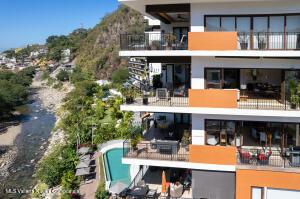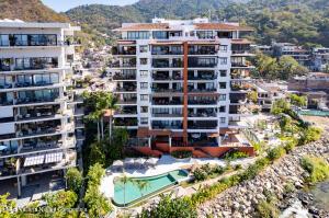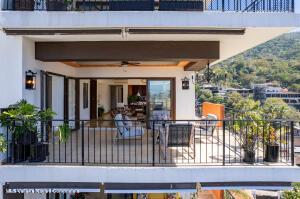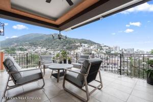 Very large and spacious apartment on an upper level on the south corner with floor-to-ceiling windows and doors around a substantial wrap-around terrace with expansive views of the mountains, the ocean, and the Rio Cuale. Large remodeled kitchen is fully equipped. Three bedrooms three bathrooms. Garage parking space and bodega included. Direct and secure elevator access. Common areas include lush tropical gardens and a newly constructed swimming pool. Comfortable and peaceful environment.
