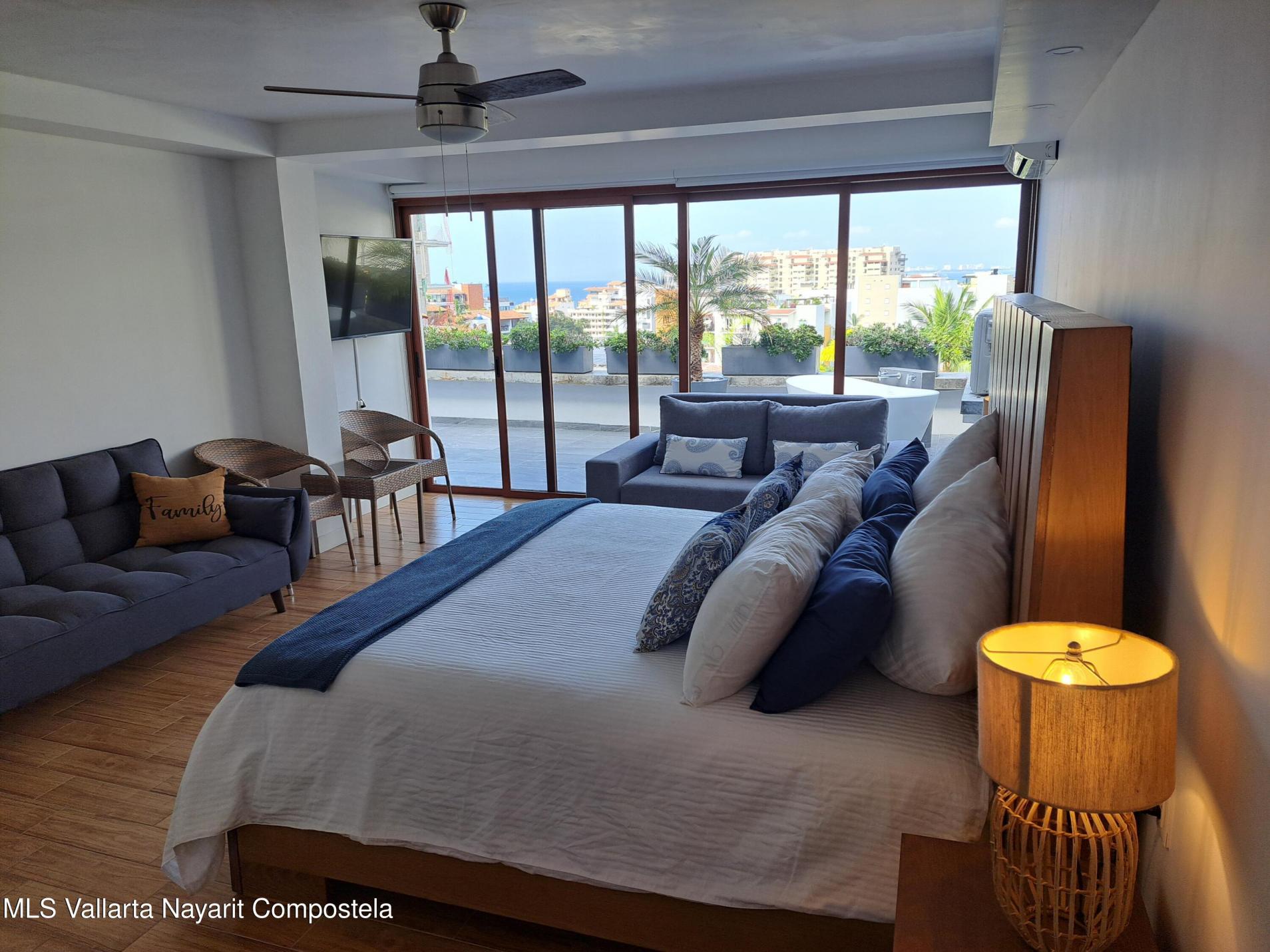 Fully remodeled contemporary spacious condo with a large terrace overlooking the bay and the city in a traditional Mexican arquitecture building that maintain the charm and warmth of Old Mexico. The living room and master open in to a large terrace with a bathtub and works great for a living open space. Located right next to the Romantic Zone in the hills of Altavista, giving you sensational views of old town and the bay. Walking distance to Zona Romantica and Los Muertos Beach and to the nice restaurant bars, cafe�s, nightclubs, markets, art galleries and theater center.