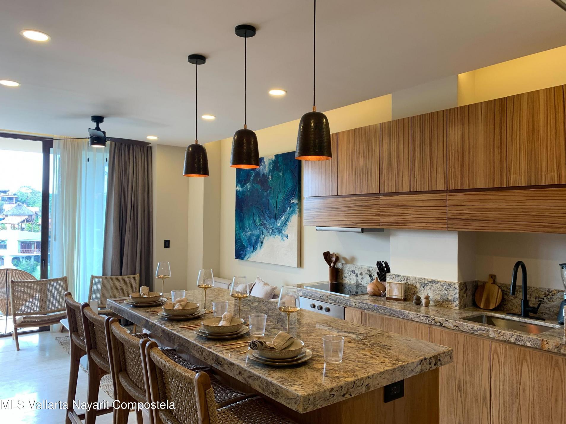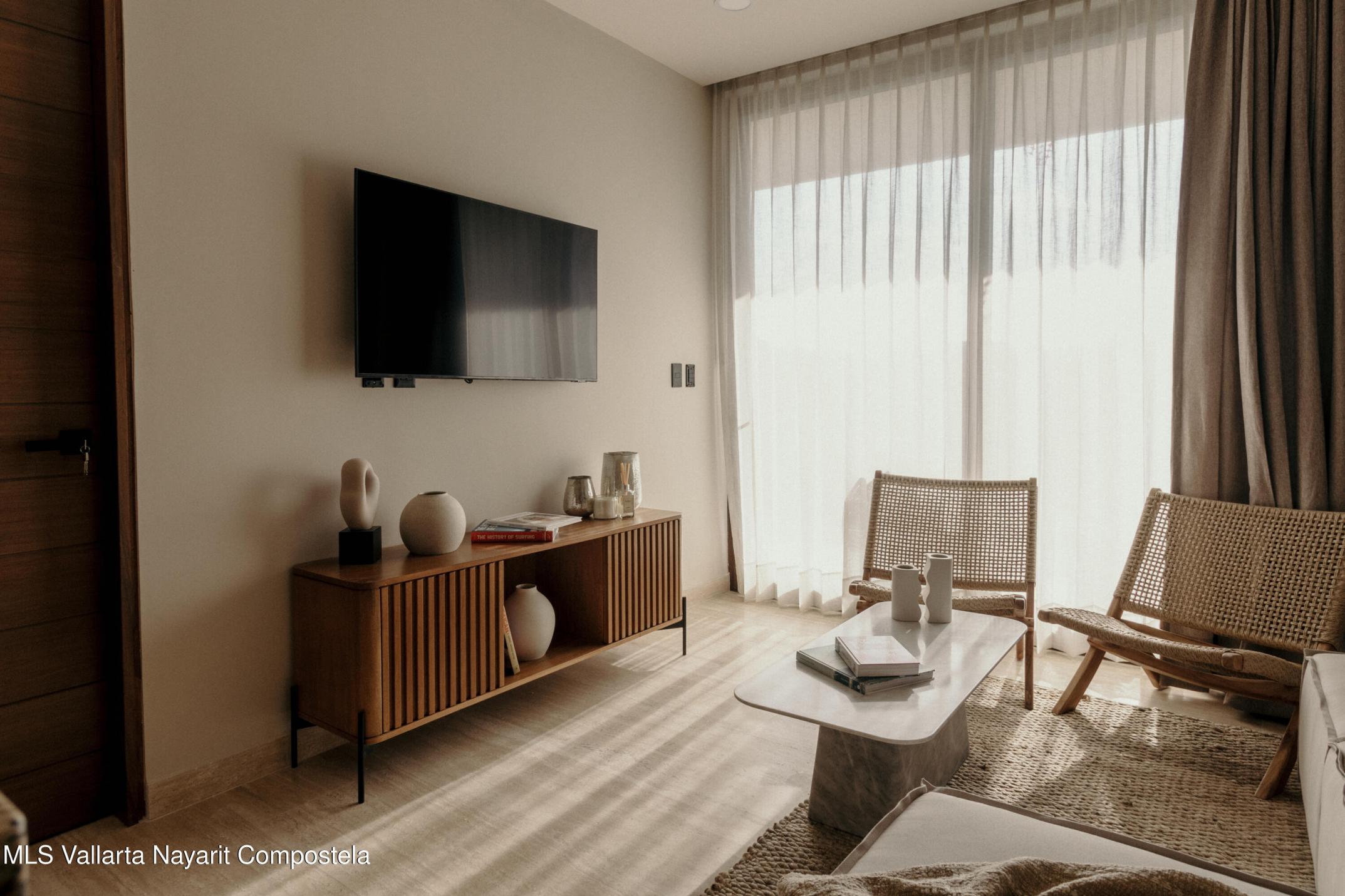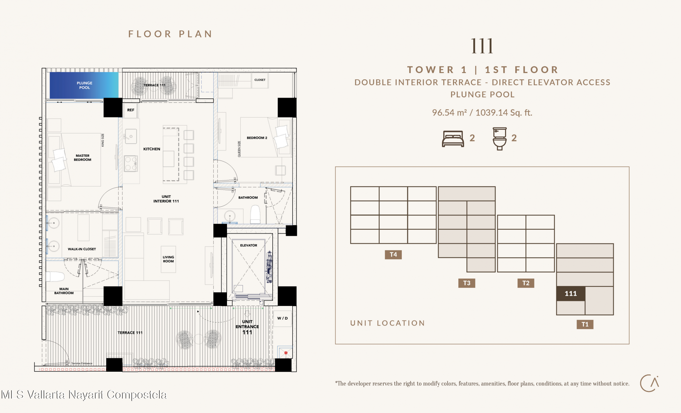 Unit 111 in Tower 1 is a bright and contemporary 2-bed, 2-bath residence on the first floor, with private elevator access opening directly into the unit. It features an Italian-style kitchen with granite countertops and Parota wood cabinetry, a spacious living area, a master suite with walk‑in closet, and a second queen-sized bedroom. Two interior terraces offer a serene oasis--one complete with a private plunge pool. The development offers extensive amenities such as a rooftop infinity pool and bar/lounge, fitness center with yoga deck, family pool, hammock lounge, surfboard storage, co‑working space, kids club, pet garden, concierge and valet parking--with delivery scheduled for January 2026.