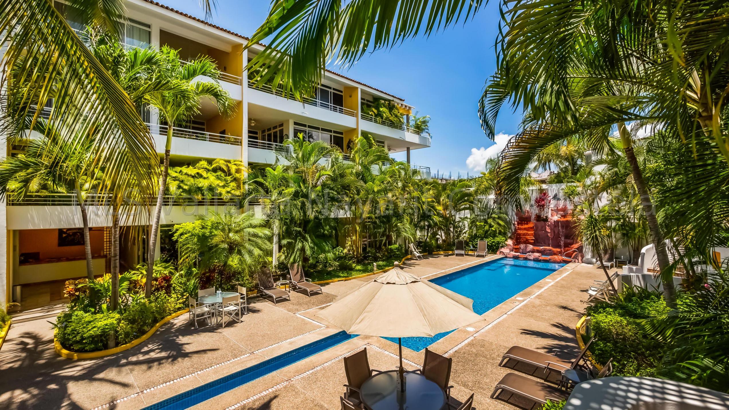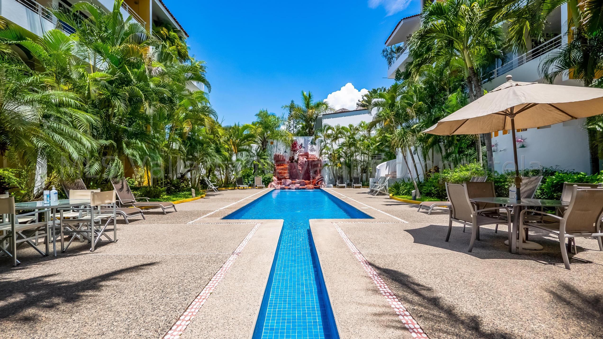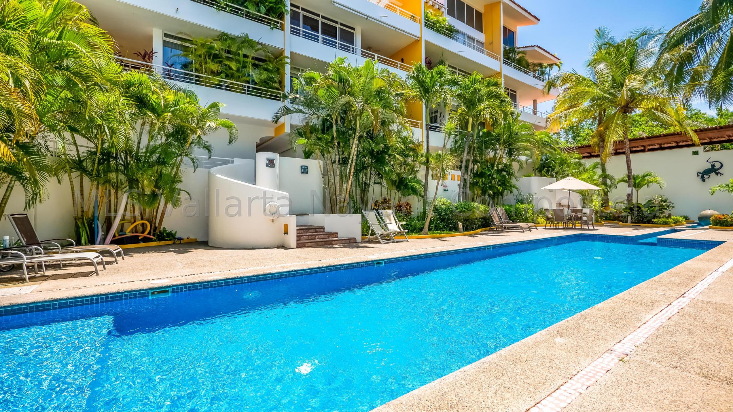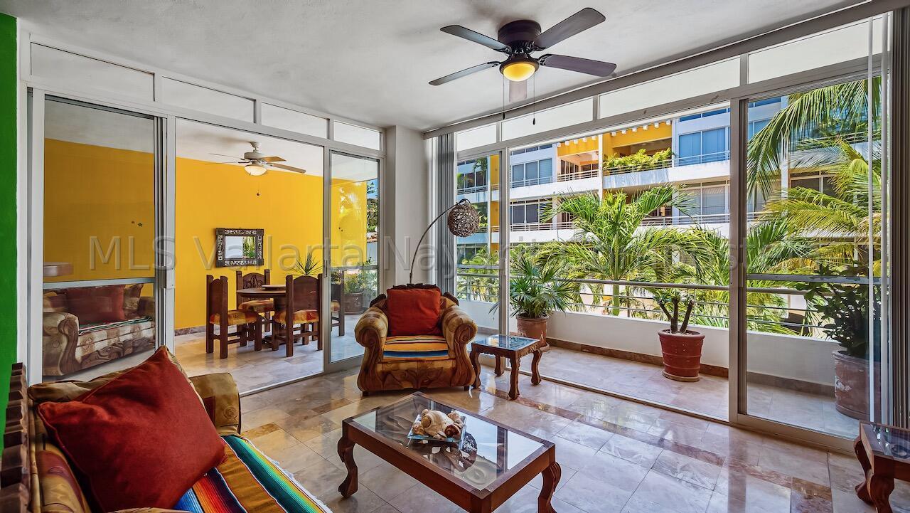 ENGLISH click More. Amplio Condominio de 2 Recamaras - A una Cuadra de la Playa Bucerias! Descubra su paraiso en este condominio de 2 recamaras y 2 banos con gran balcon, idealmente ubicado a solo una cuadra de la playa de Bucerias. Disfrute de las comodidades de la piscina, cascada, gimnasio, y una terraza en la azotea con impresionantes vistas al mar y a la montana, seguridad 24-7, portabicicletas, y en el sitio admin. Nota: no hay ascensor, pero es solo el segundo piso. Totalmente amueblado, este condominio esta listo para mudarse con techos altos, e incluye una plaza de aparcamiento cubierto. Perfecto como residencia permanente, casa de vacaciones, o propiedad de inversion, este condominio esta a pasos de la playa, supermercados, restaurantes, senderos y mucho mas.