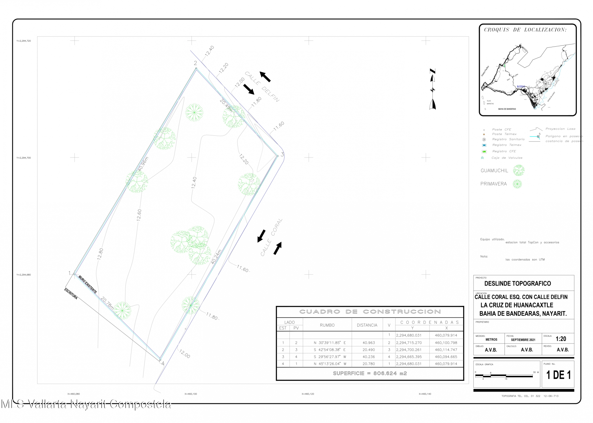Terreno en VENTA en La Cruz de Huanacaxtle.Ideal para desarollar un condominio o una area comercial, 806 M2 con uso de suelo H127 ubicado en esquina a solo una cuadra de la Carretera Principal Mar Mediterraneo de lado mar. a 4 cuadras de la Marina de la Cruz de Huanacaxtle. Tiene dimensiones de 40.96 mt por la calle Coral y 20.78 mt por la calle DelfinEste terreno se encuentra bardeado.Land for SALE in La Cruz de Huanacaxtle.Ideal for developing a condominium or commercial area. 806 M2 with H127 zoning, located on a corner lot just one block from the main Avenue Mediterranean Highway (seaside).4 blocks from the La Cruz de Huanacaxtle Marina. It measures 40.96 m along Coral Street and 20.78 m along Delfin Street.This lot is fenced.
