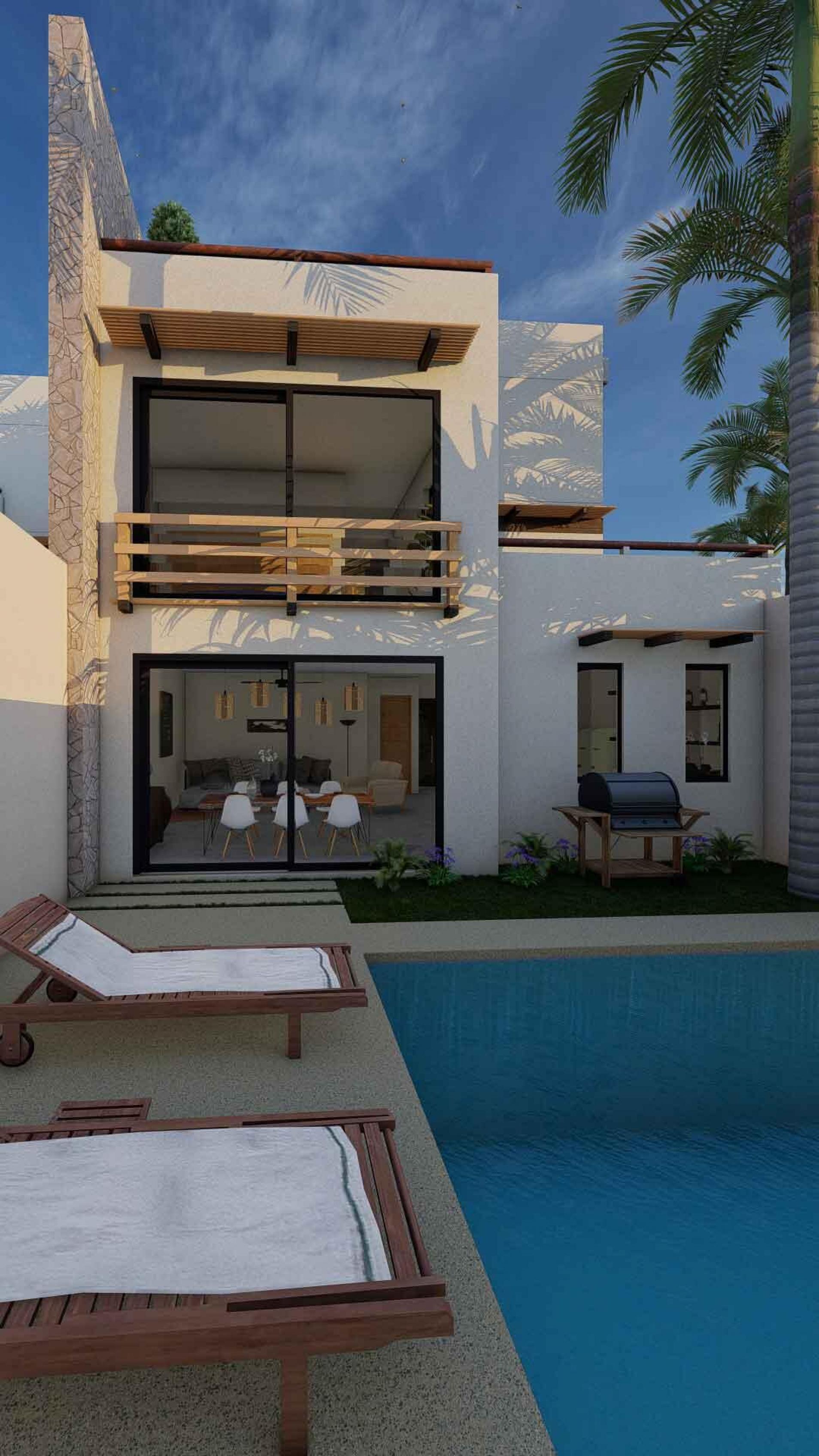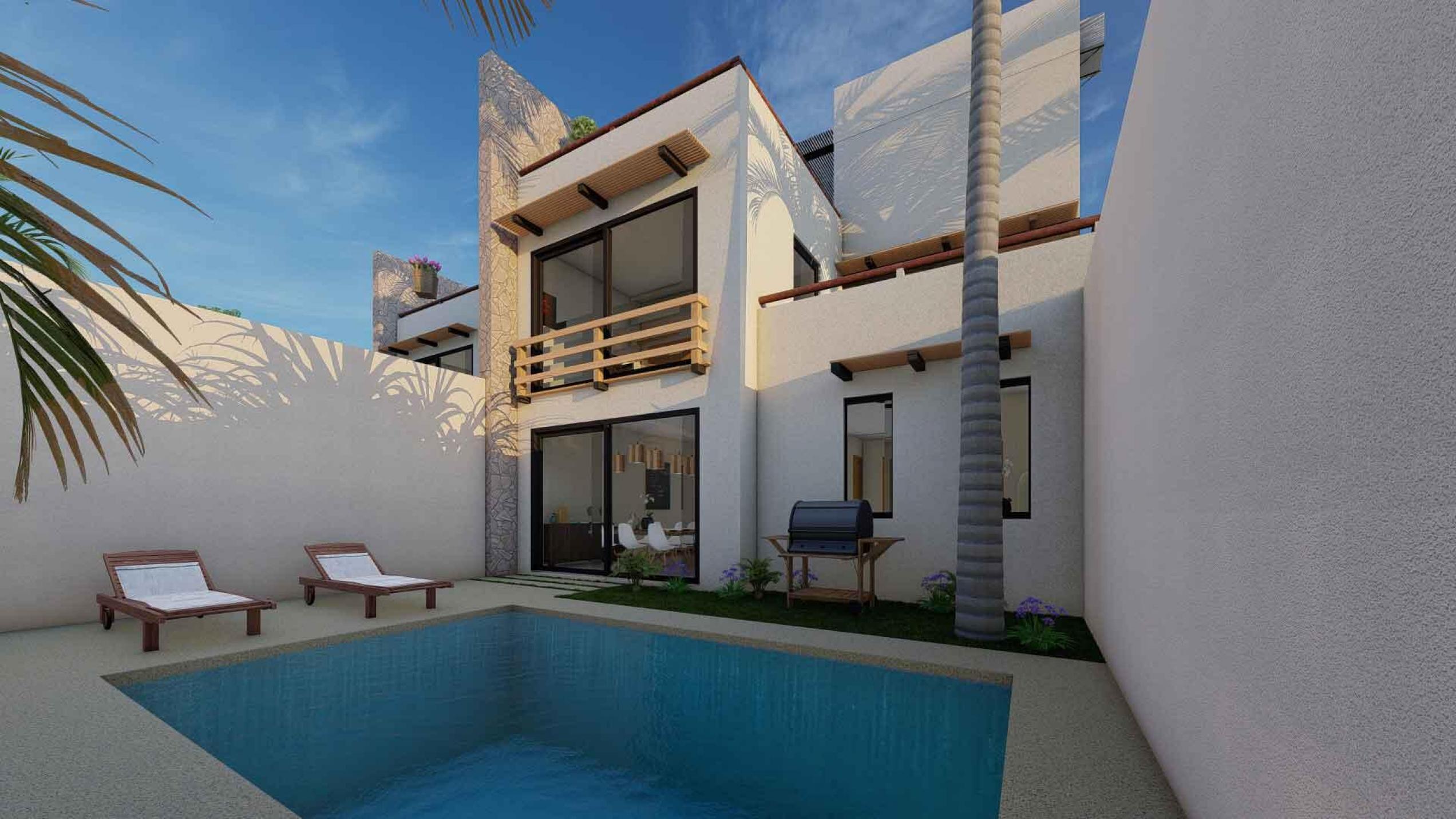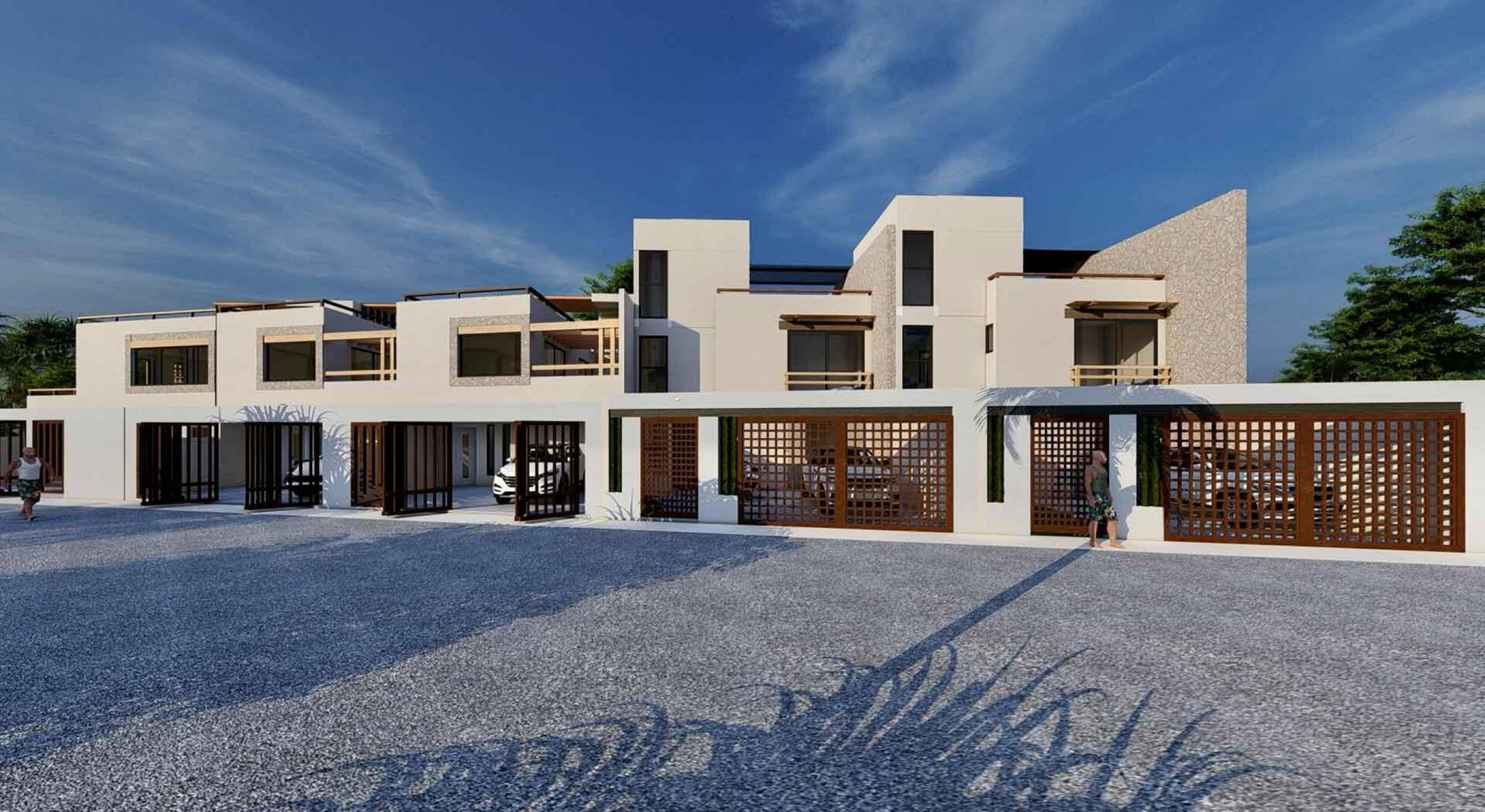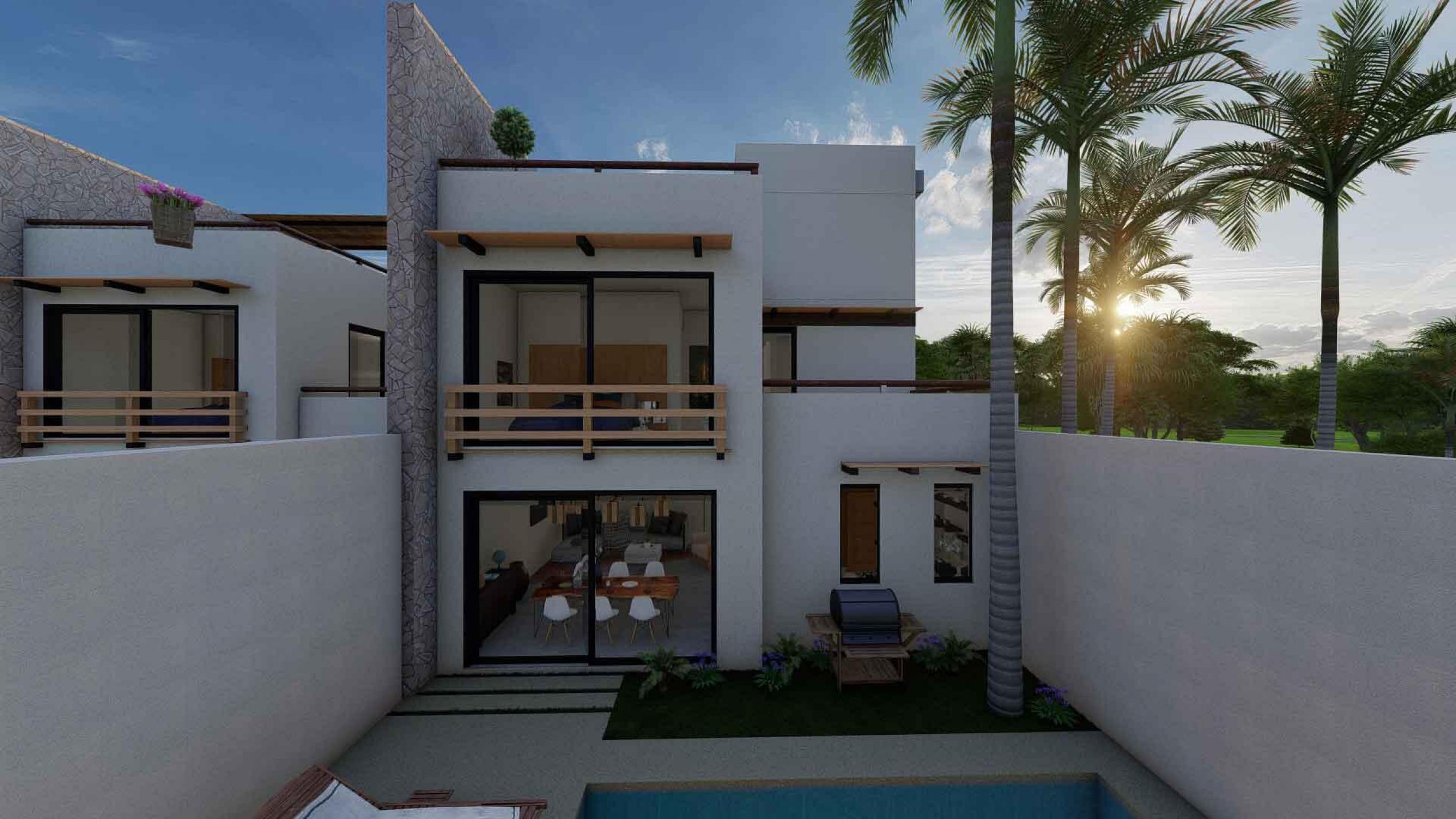 La Panchita Residences is a new development of modern townhomes on individual lots, with the first unit currently under construction and available for pre-sale. Each home will feature three en suite bedrooms, two levels, and a rooftop terrace. The entry level includes a bedroom, kitchen, spacious living/dining area, backyard, and a sunny pool. Upstairs, you'll find the primary suite with dressing room, a third en suite bedroom, a rear terrace, and a spiral staircase leading to the rooftop, which will include a pergola, wet bar, and bonus room--ideal for a quiet office space.