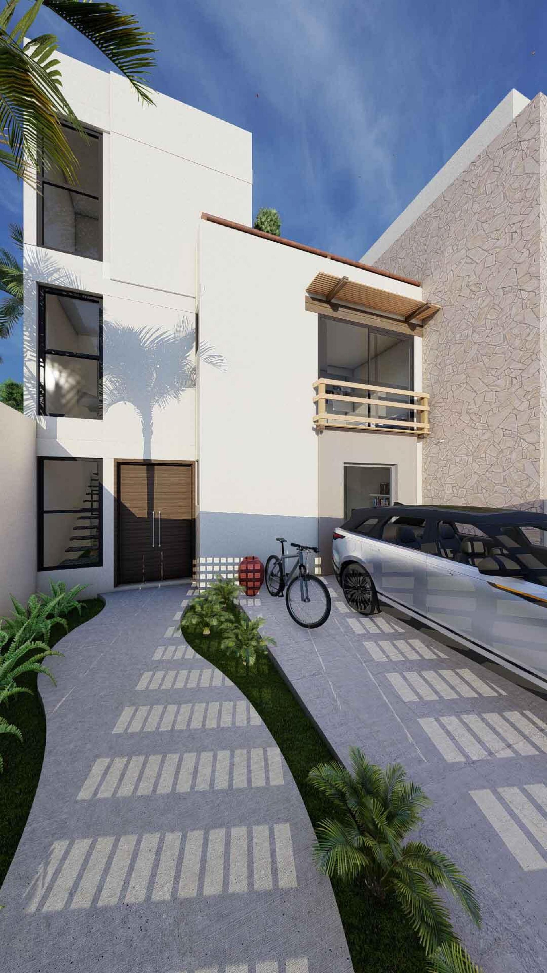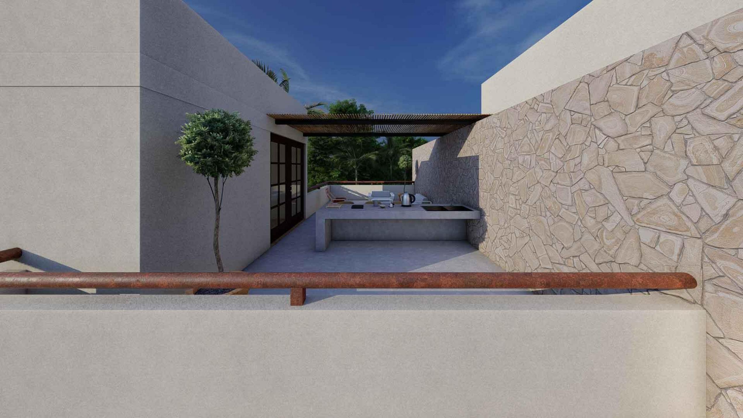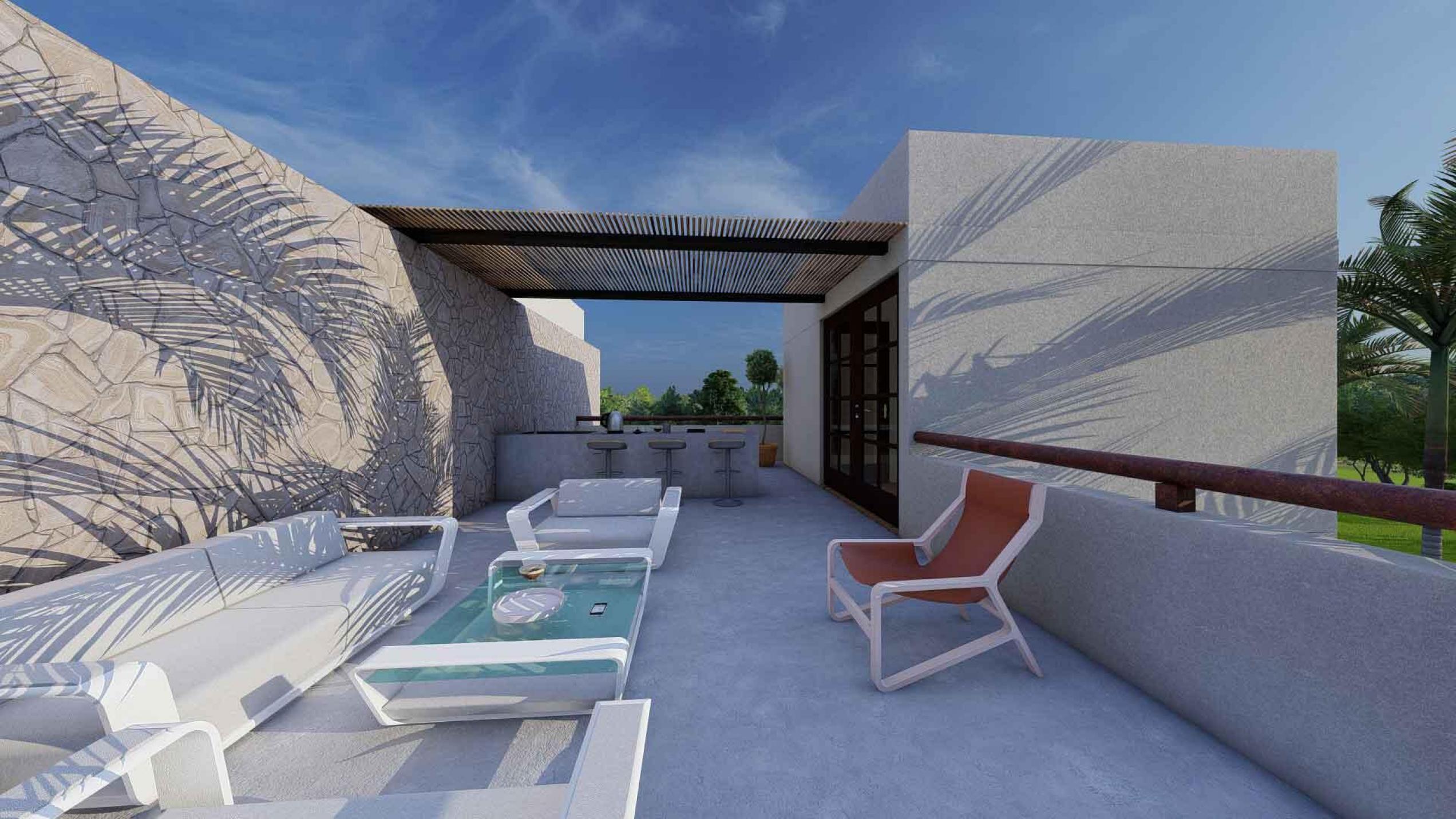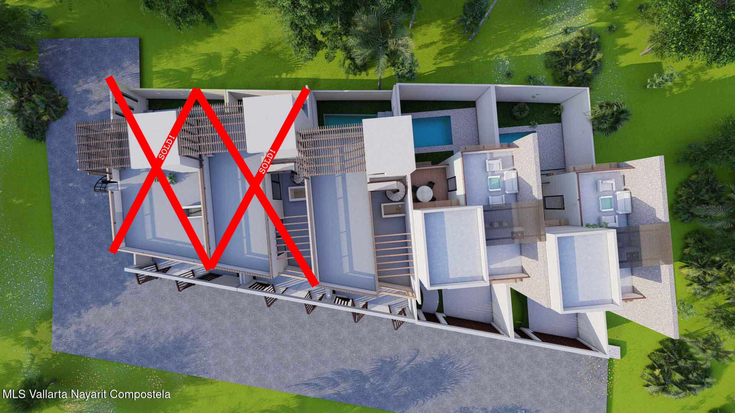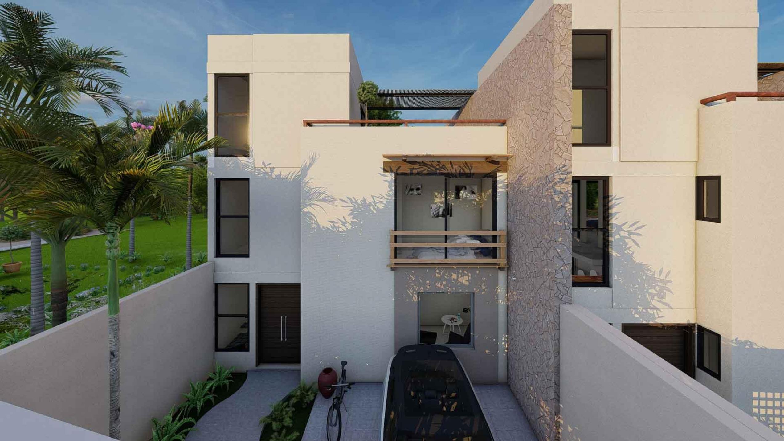 La Panchita Residences is a new development of modern townhomes on individual lots, with the first unit currently under construction and available for pre-sale. Each home will feature three en suite bedrooms, two levels, and a rooftop terrace. The entry level includes a bedroom, kitchen, spacious living/dining area, backyard, and a sunny pool. Upstairs, you'll find the primary suite with dressing room, a third en suite bedroom, a rear terrace, and a spiral staircase leading to the rooftop, which will include a pergola, wet bar, and bonus room--ideal for a quiet office space.